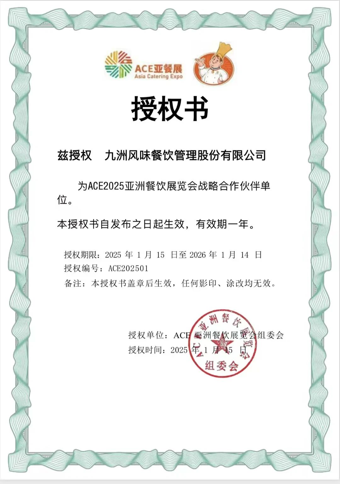 1月19日,ACE亞洲餐飲展覽會(簡稱ACE亞餐展)組委會一行到訪九洲風(fēng)味餐飲管理股份有限公司(簡稱九洲風(fēng)味)。雙方就共同做大做強ACE亞餐展達(dá)成共識,并將在ACE2025第三屆亞洲餐飲展覽會(簡稱ACE第三屆亞餐展)展開戰(zhàn)略合作。